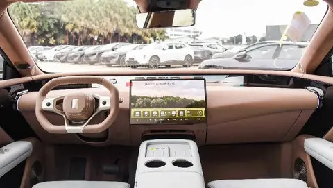 进入车内,我们能够明显感觉到车内设计的高品质与科技感,特别中控台的配置显得十分大气和富有科技感。它采用了大面积的软质材料覆盖,搭配精致的缝线工艺,摸起来特别舒服。中控台采用分层的设计理念,上方为35.4英寸的全液晶的仪表盘,这个仪表盘的分辨率已经达到了4K,显示效果极为细腻,下方则是15.6英寸的悬浮式中控屏,操作流畅且界面友好。这个车的方向盘采用了平底设计的三辐式多功能方向盘设计,整个方向盘的握感十分舒服,而且集成了多项实用功能,如语音控制、定速巡航等,极大地方便了驾驶者的操控。而且这个方向盘还支持电动调节,可以根据驾驶者的喜好和坐姿自动调整角度,同时还拥有加热和记忆功能,确保在寒冷季节也能提供舒适的驾驶体验。而车辆的换挡形式则是采用了电子式换挡设计,这样操作起来会更加简单,而且节省了中控台空间,使得整体布局更加简洁,中台位置配备一块无线电充电面板,可以同时为两块不同的移动设备进行充电。